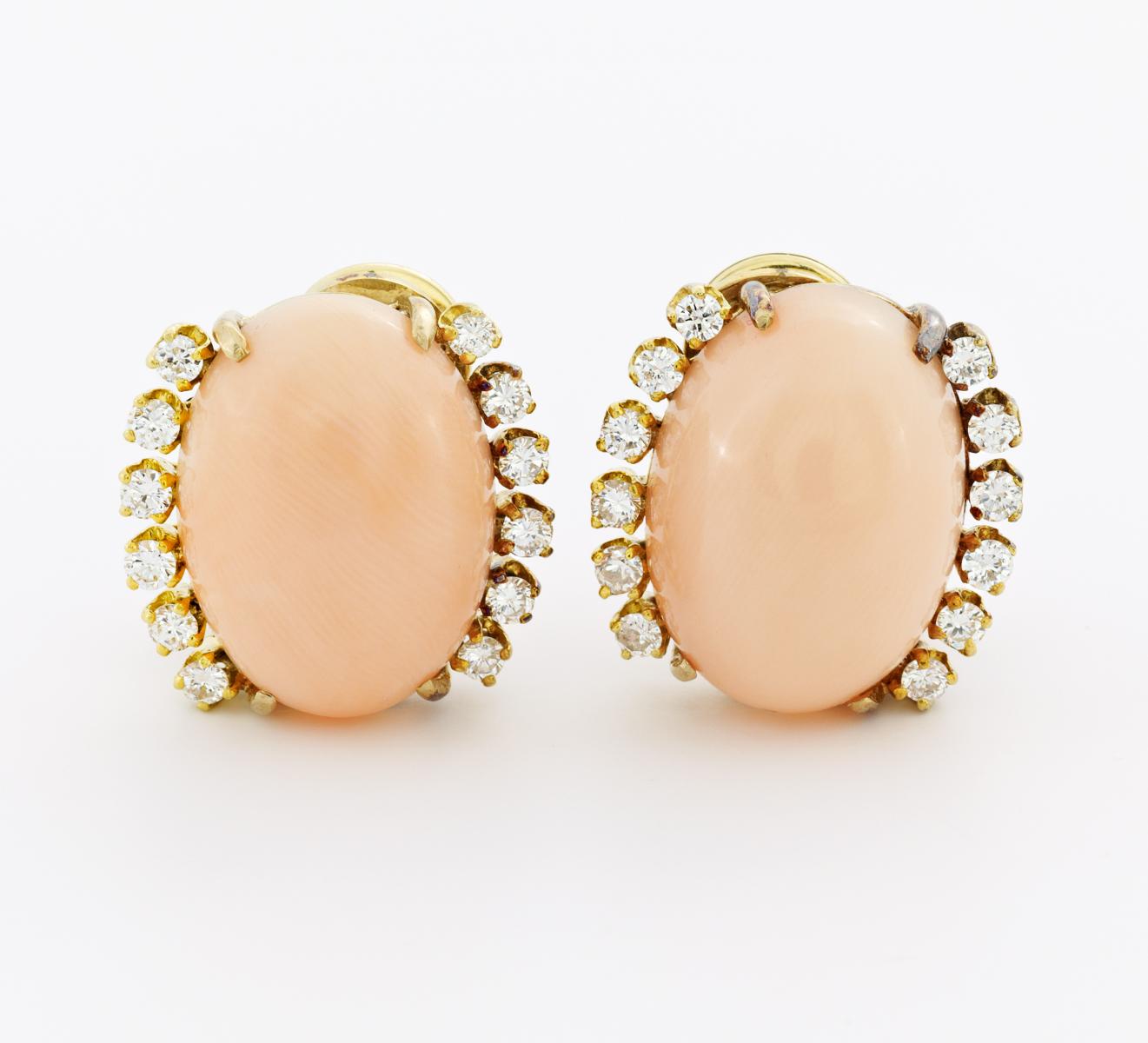 Ohrsteckclips mit Engelshautkorall-Diamantbesatz. 585/- GELBGOLD.
