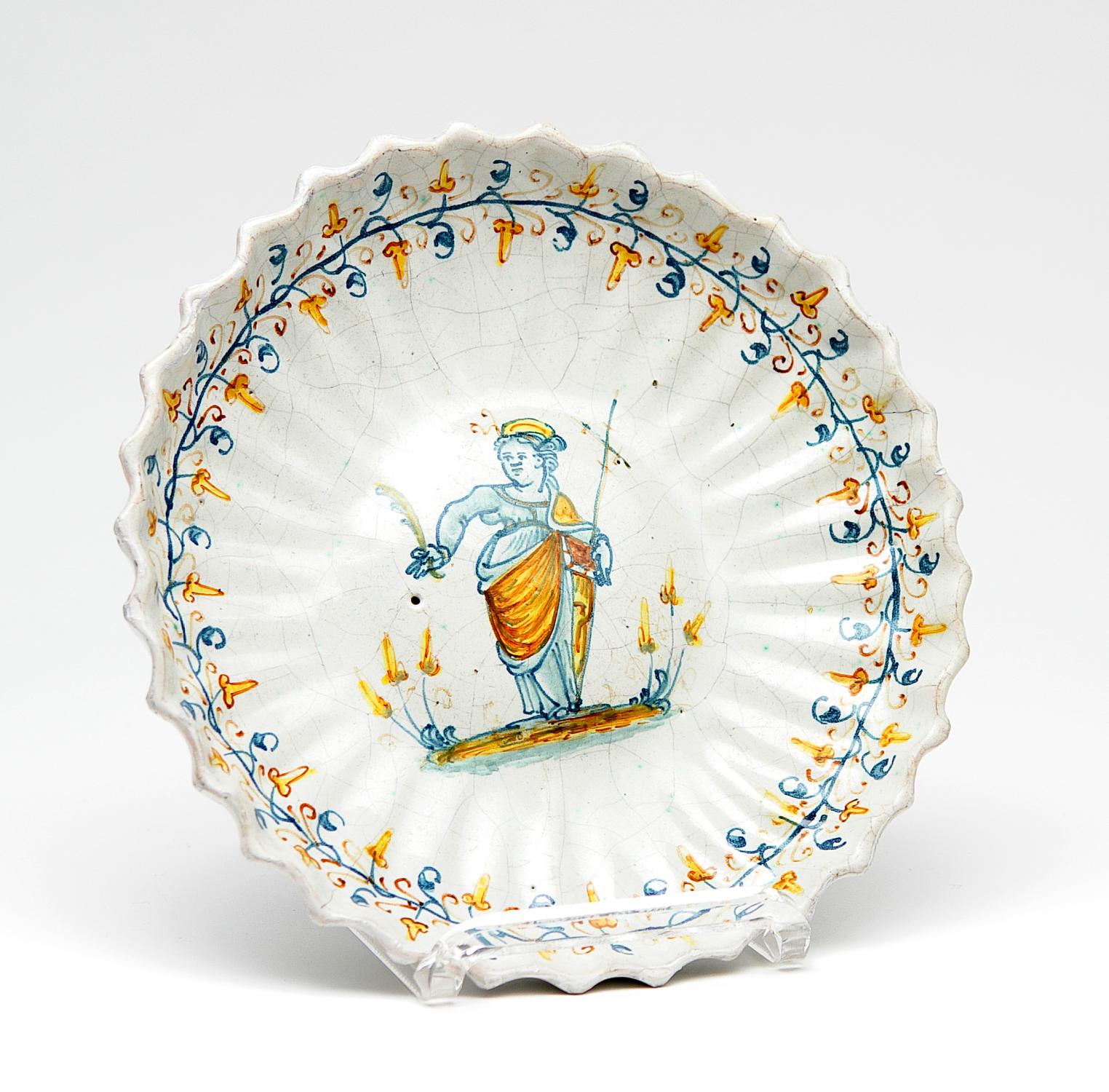 KLEINE TAZZA MIT HEILIGENFIGUR.