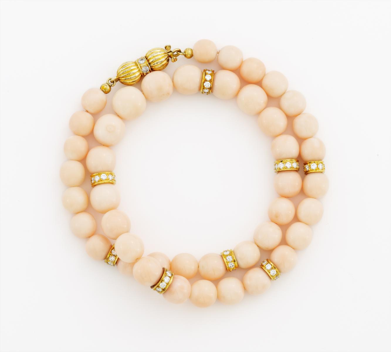 Feines Korallperlencollier mit Diamantbesatz. SCHLIEßE/ZWISCHENELEMENTE: 585/- GELBGOLD.