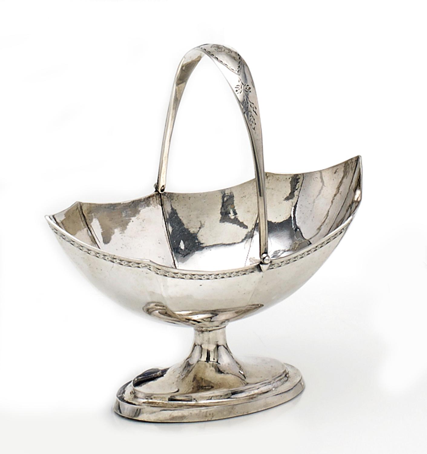 Höhe 11cm, Länge 18. Ovaler Fuß mit fassettiertem Korpus. Der Bügelhenkel mit Gravurdekor und Monogramm E.D. Ca. 227cm.