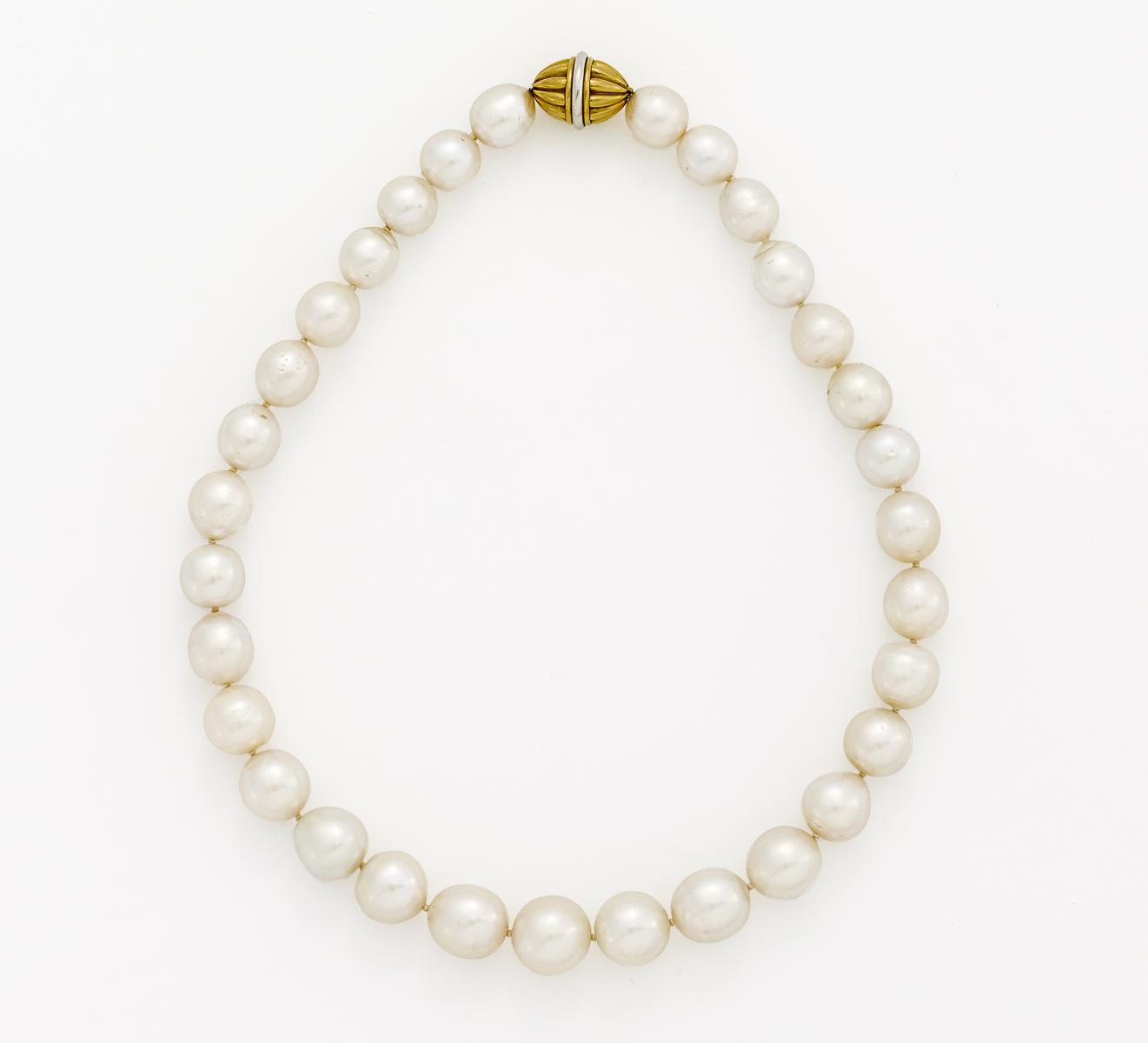 Weiße Südsee-Zuchtperlenkette. DREHVERSCHLUß: 750/- GELB-/WEIßGOLD, SIGN. HEMMERLE.
