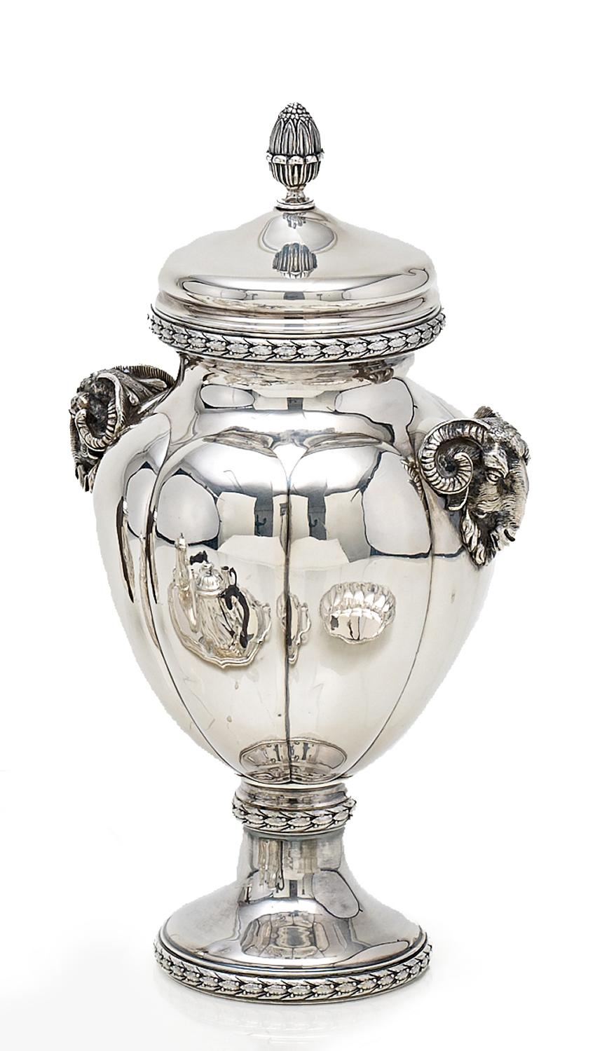 Höhe 42. Rundfuß mit ovoidem Korpus. Seitlich plastisch gearbeitete und fein gravierte Widderköpfe