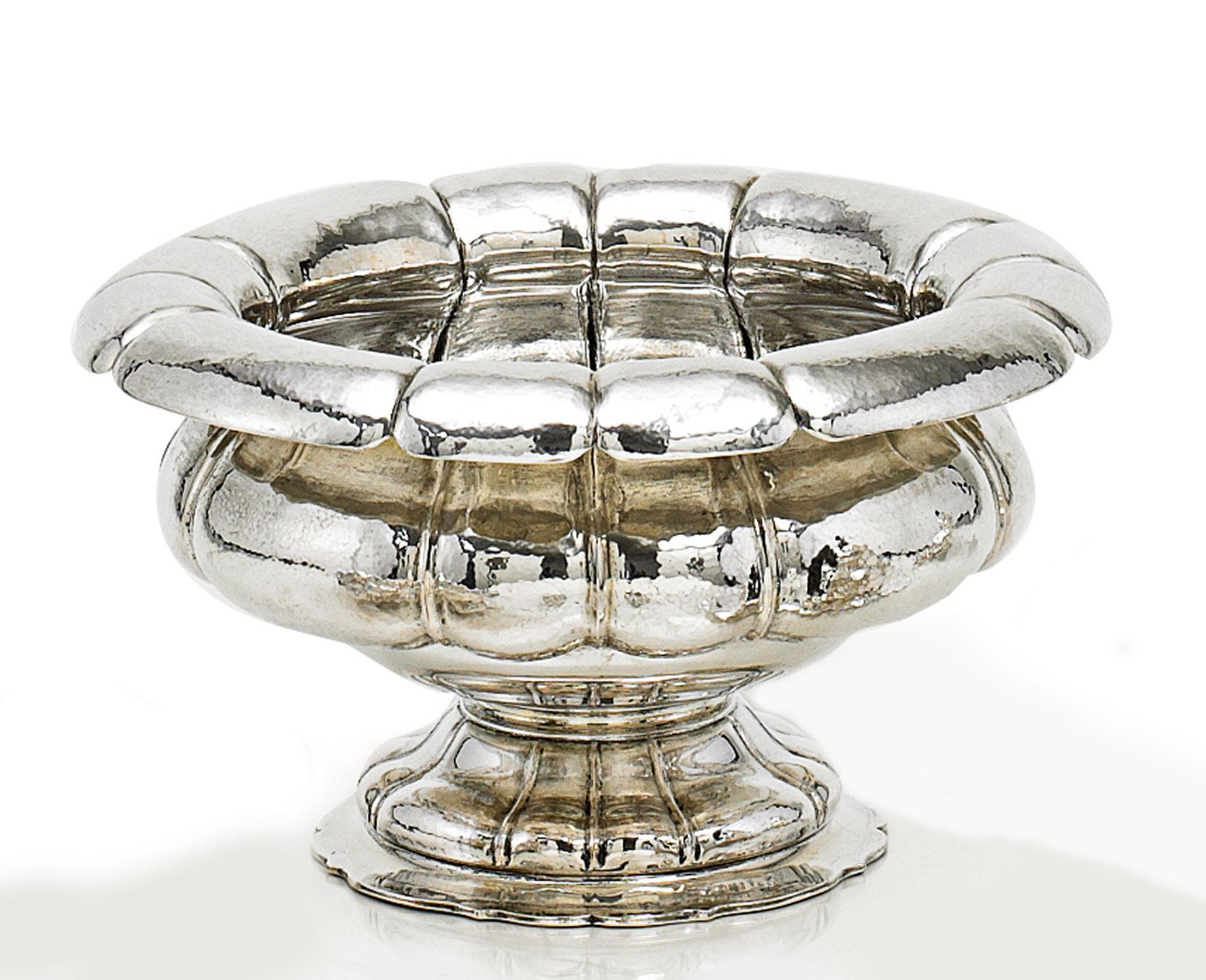 Höhe 23cm, + 40. Martelierte Oberfläche der gebauchten Wandung mit geraden Zügen untergliedert. Auf der