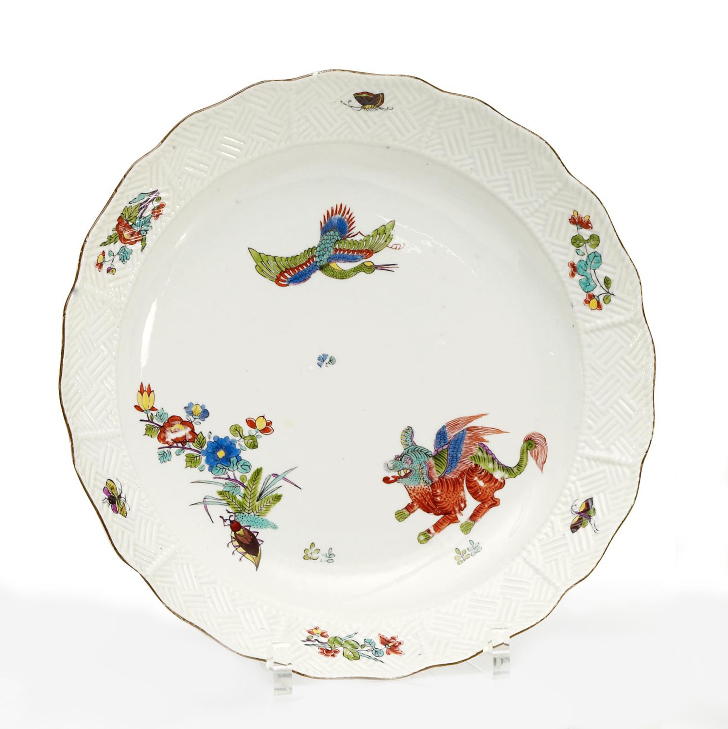 fliegender Reiher, ein Maikäfer neben Blütenzweig sowie geflügeltes Fabelwesen. Schwertermarke, Formerzeichen ///, 67 geprägtcm.