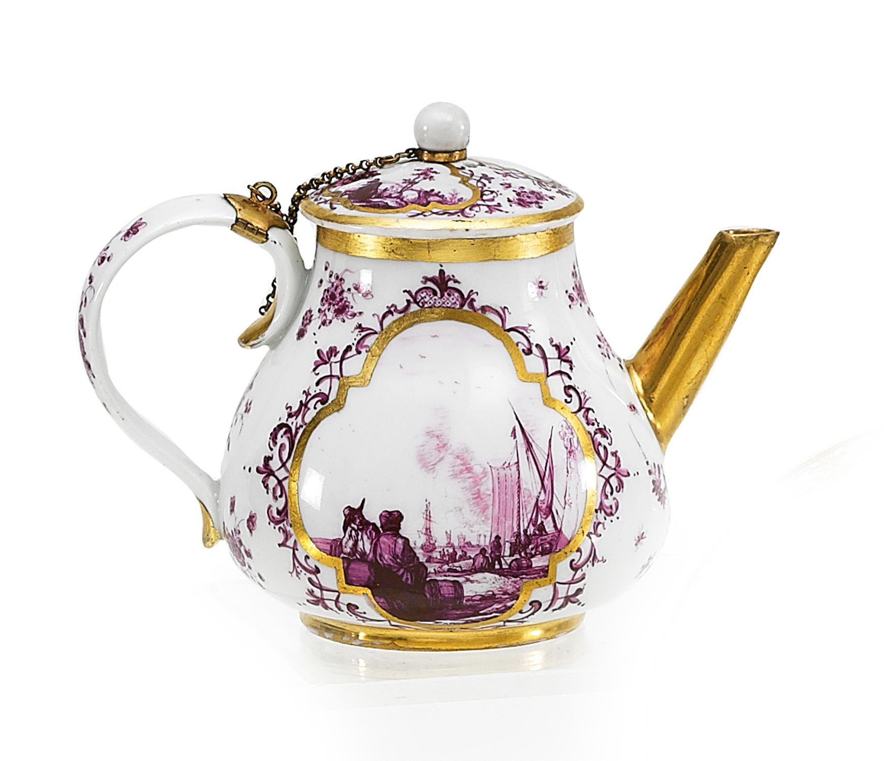 TEEKANNE MIT KAUFFAHRTEISZENEN IN PURPURCAMAIEU.