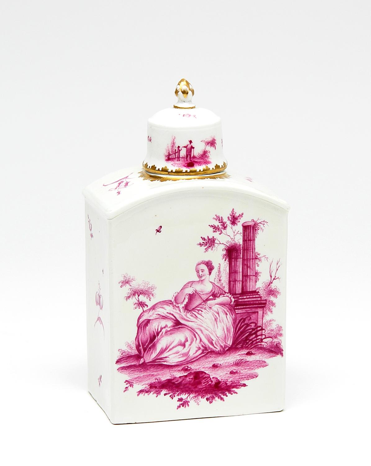 Höhe 14. Auf einer Seite einmal Kavalier mit Laute, eine lagernde Dame auf gegenüberliegender Seite. Blaue Manufakturmarke CT unter Kurhut mit 8 (?)cm.