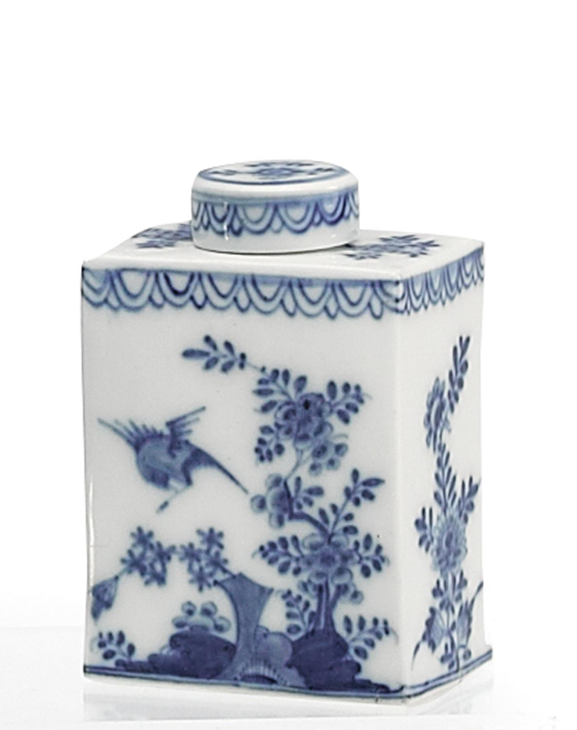 KLEINE TEEDOSE MIT FELS-UND-VOGEL-DEKOR.
