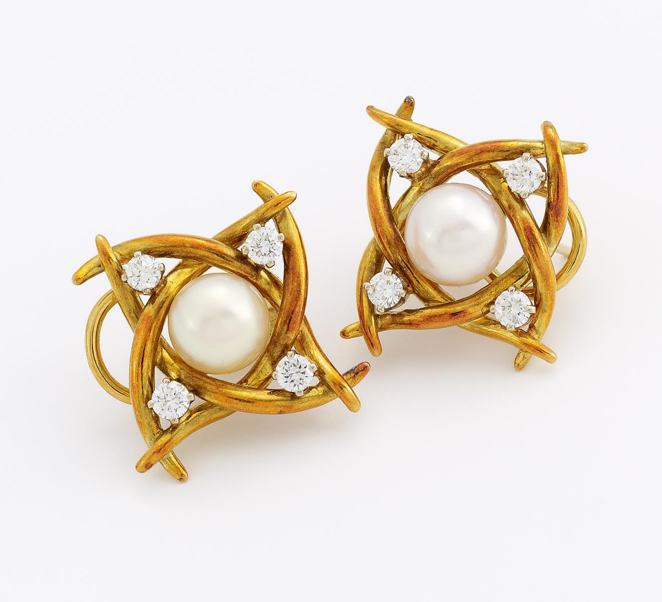 Ohrsteckclips mit Perl-Diamantbesatz, Tiffany. 750/- GELB-/ROTGOLD, WEIßGOLDVERBÖDUNG.