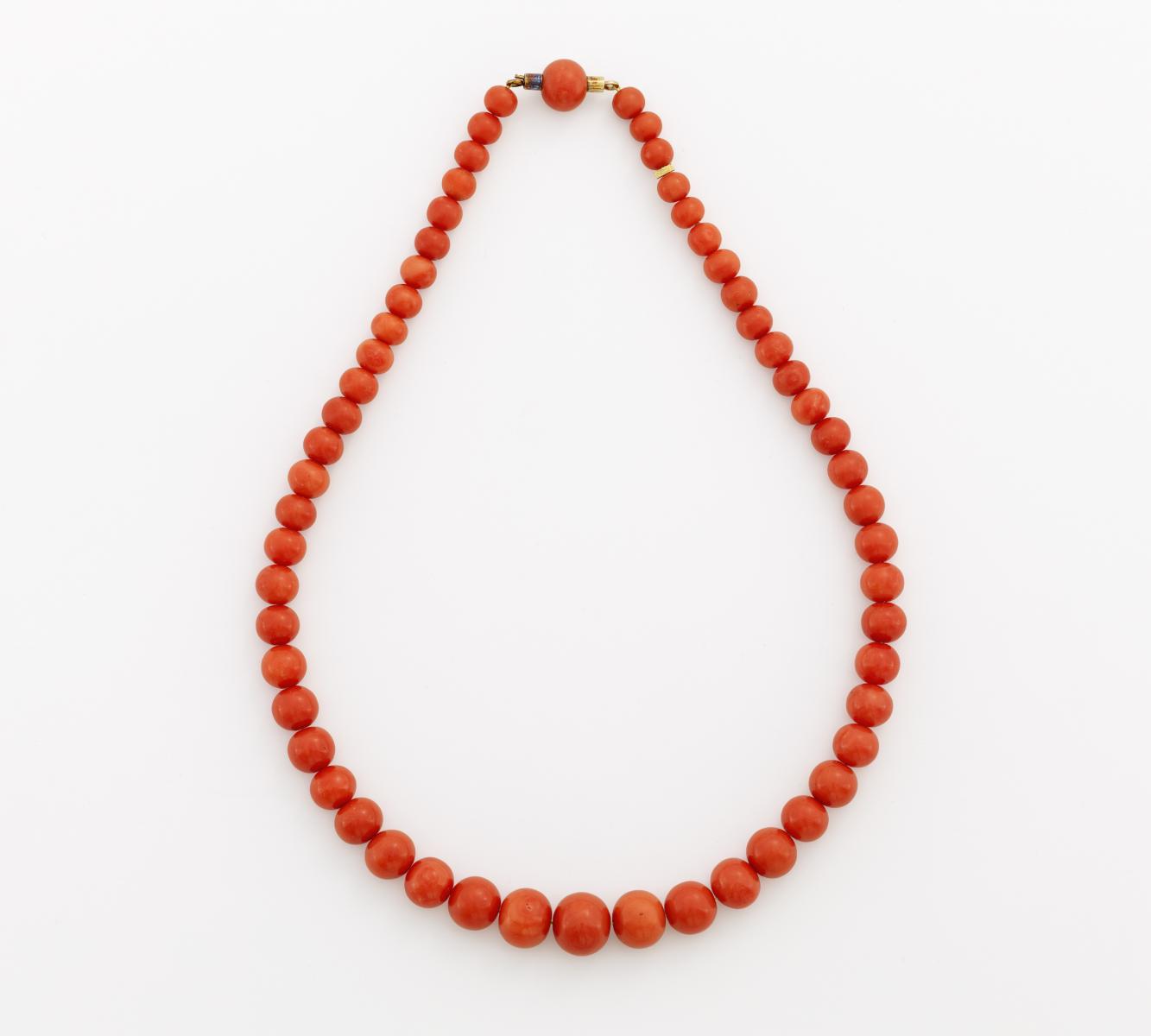 55 feine, rund-unrunde Korallperlen (Mittelmeer), D. 7-13,6mm; Koralle im Verschluß, D. 11,4mm, EU-RM: L. 48,0cm. Italien.
