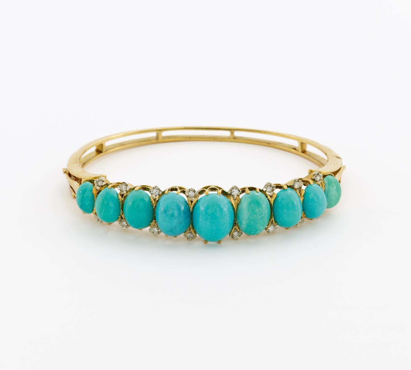 Armspange mit Türkis-Diamantbesatz. 750/- GELBGOLD, WEIßGOLDVERBÖDUNG.