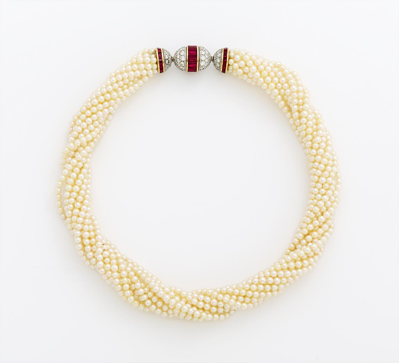 Mehrreihiges Perlencollier mit Diamant-Rubin-Kugelschloß. DREHVERSCHLUß: 750/- GELB-/WEIßGOLD.