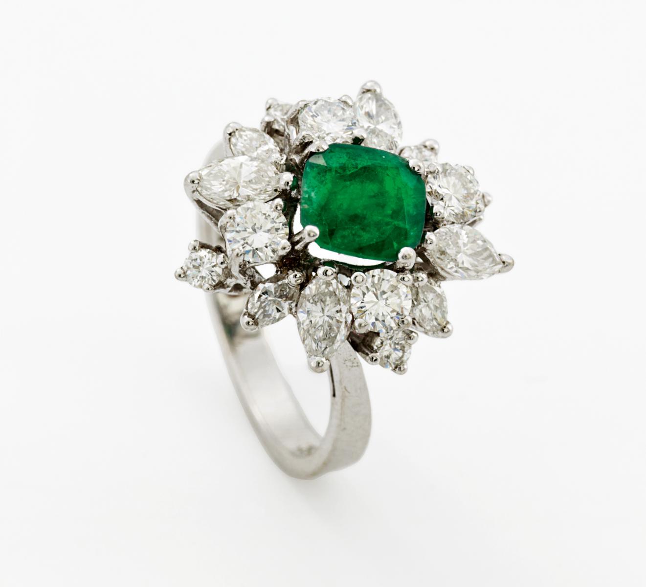 Cocktailring mit Smaragd-Diamantbesatz. 750/- WEIßGOLD.