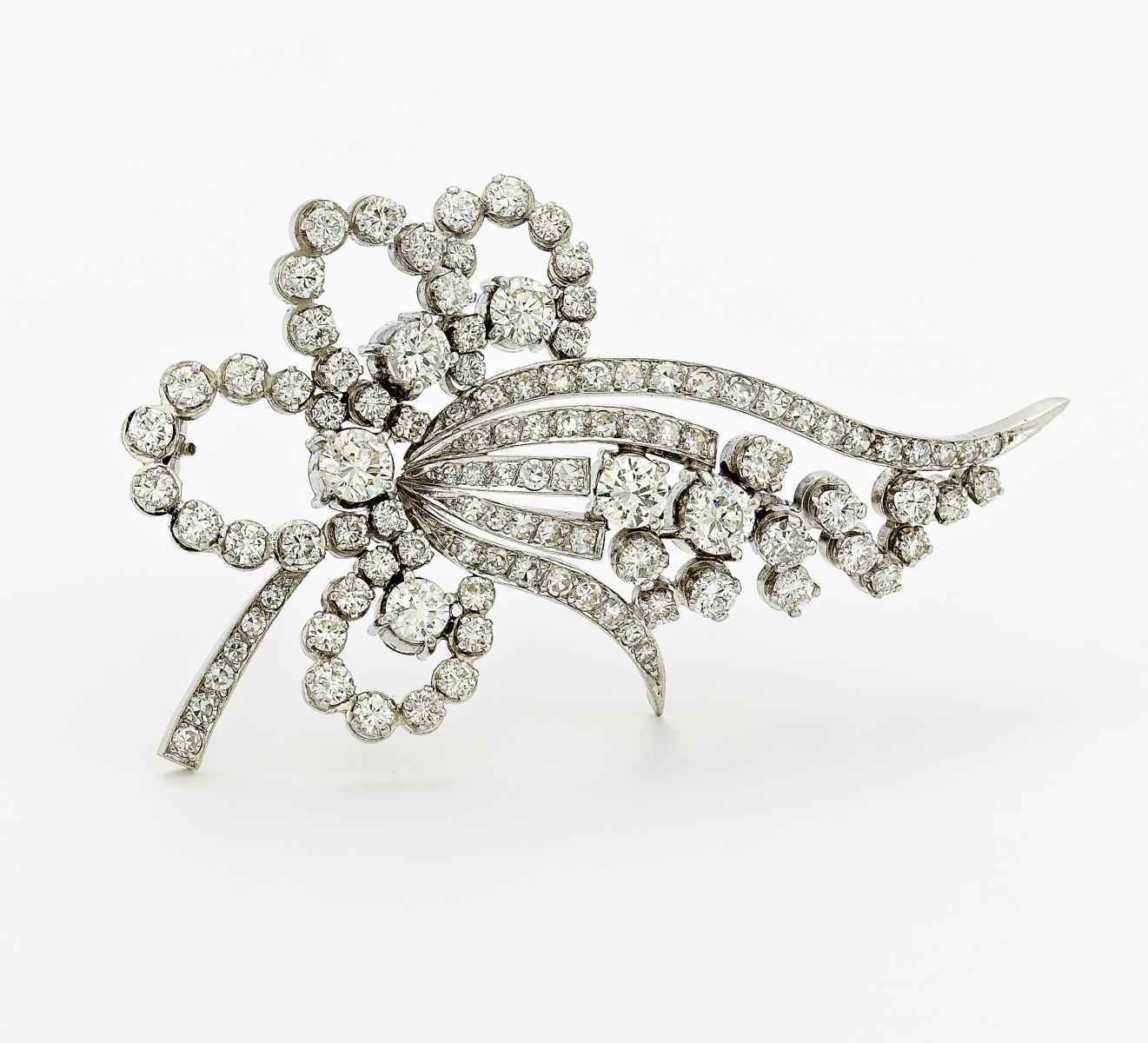 Schleifenbrosche mit Diamantbesatz. 750/- WEIßGOLD.