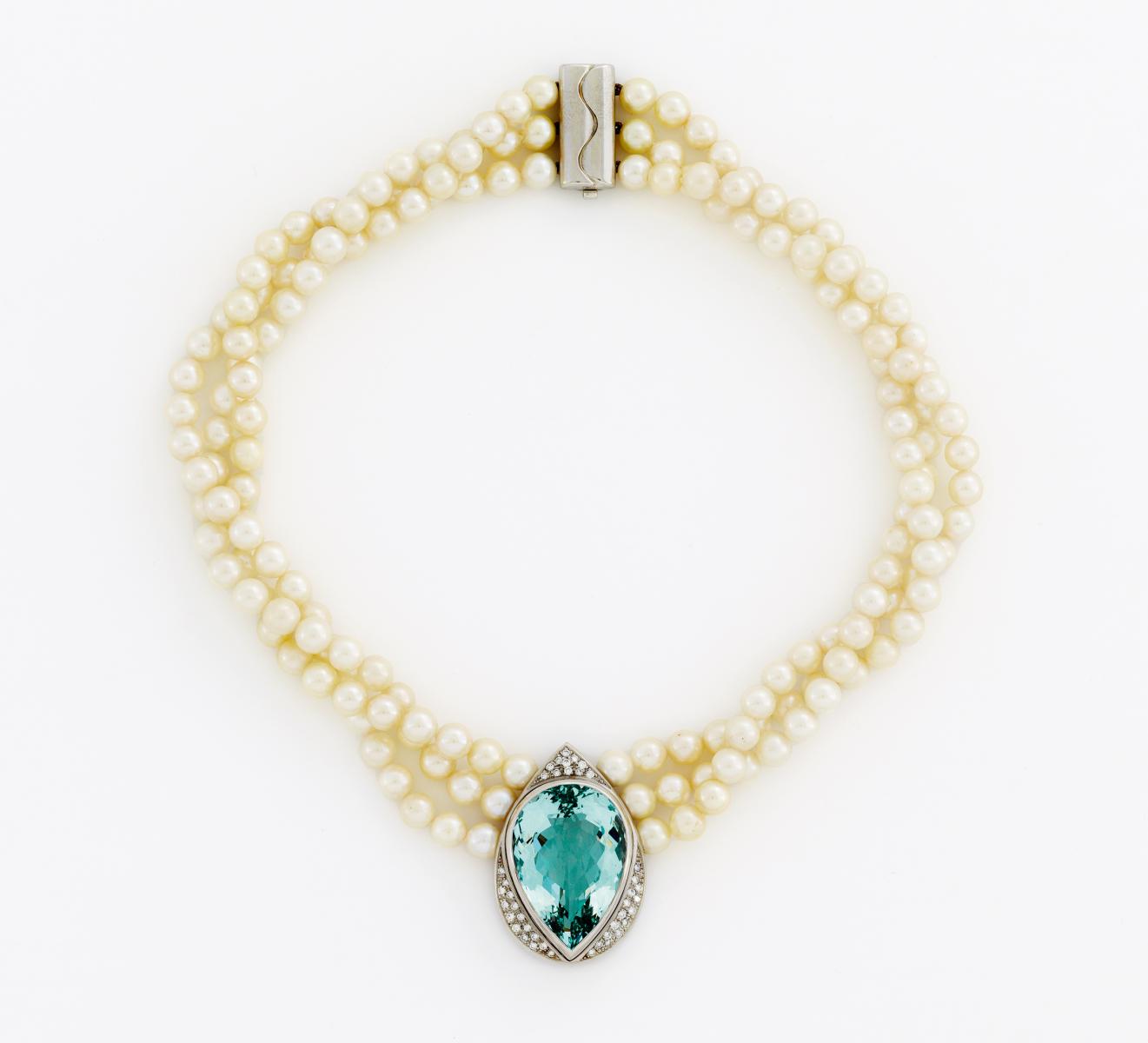 Modernes Perlencollier mit Aquamarin-Diamantbesatz. 750/- WEIßGOLD.