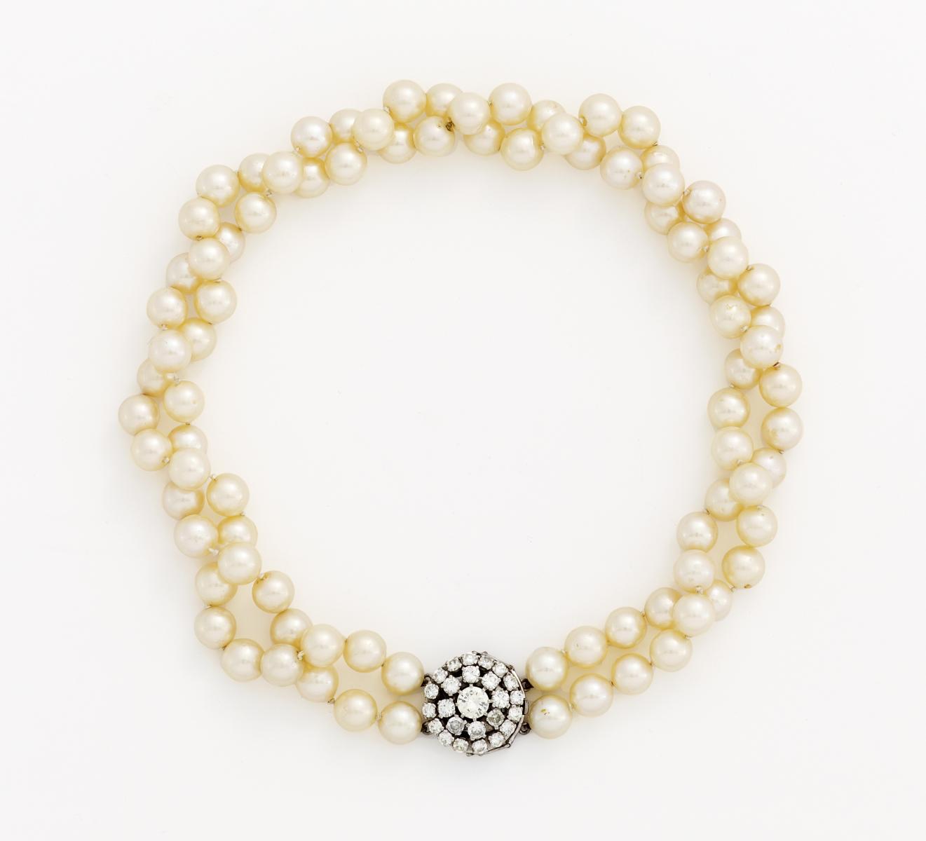 Zweireihiges Perlencollier mit Diamant-Zierverschluß. 585/- WEIßGOLD.
