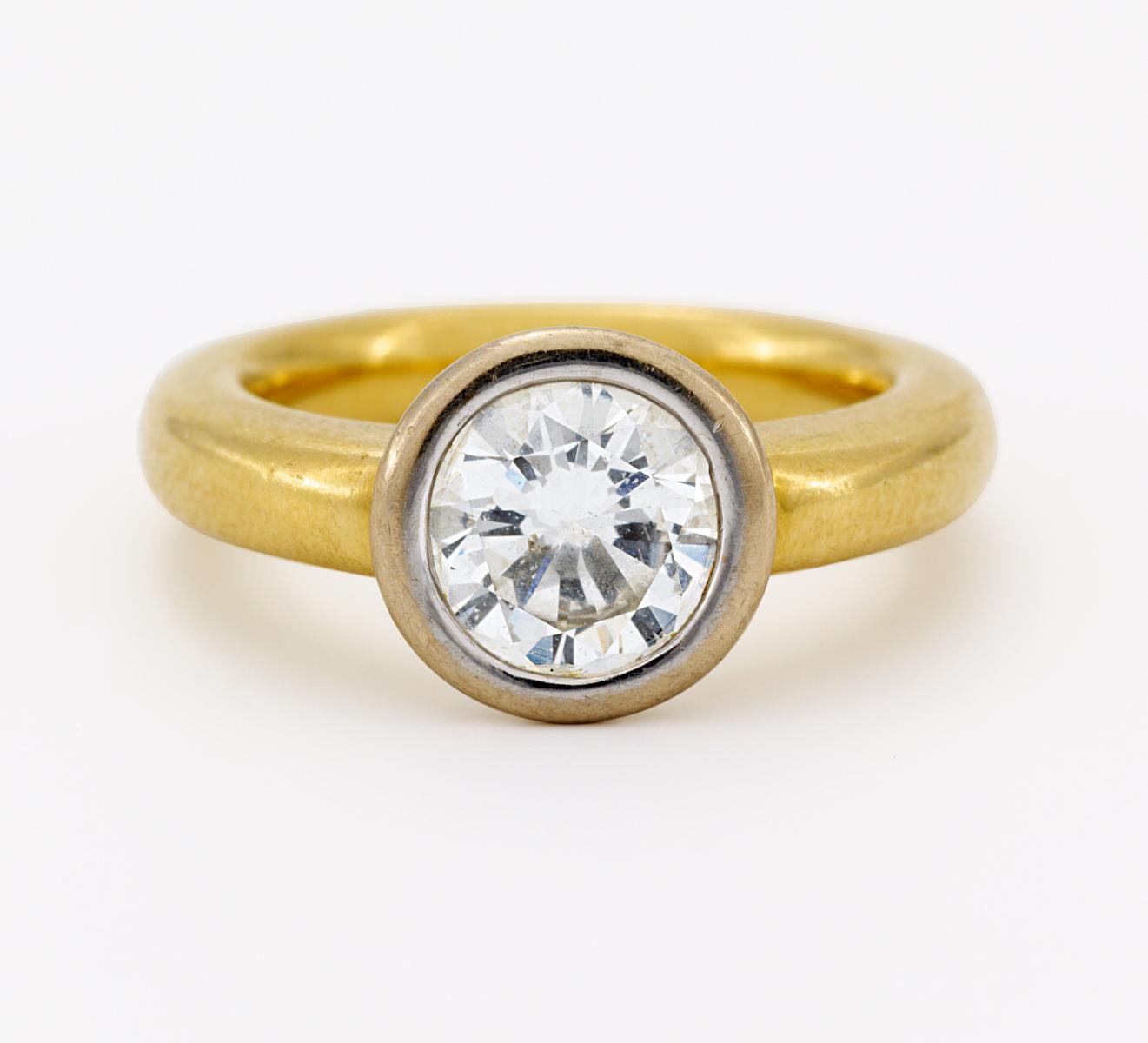 Moderner Solitaire-Ring mit Brillantbesatz. 750/- GELB-/WEIßGOLD.