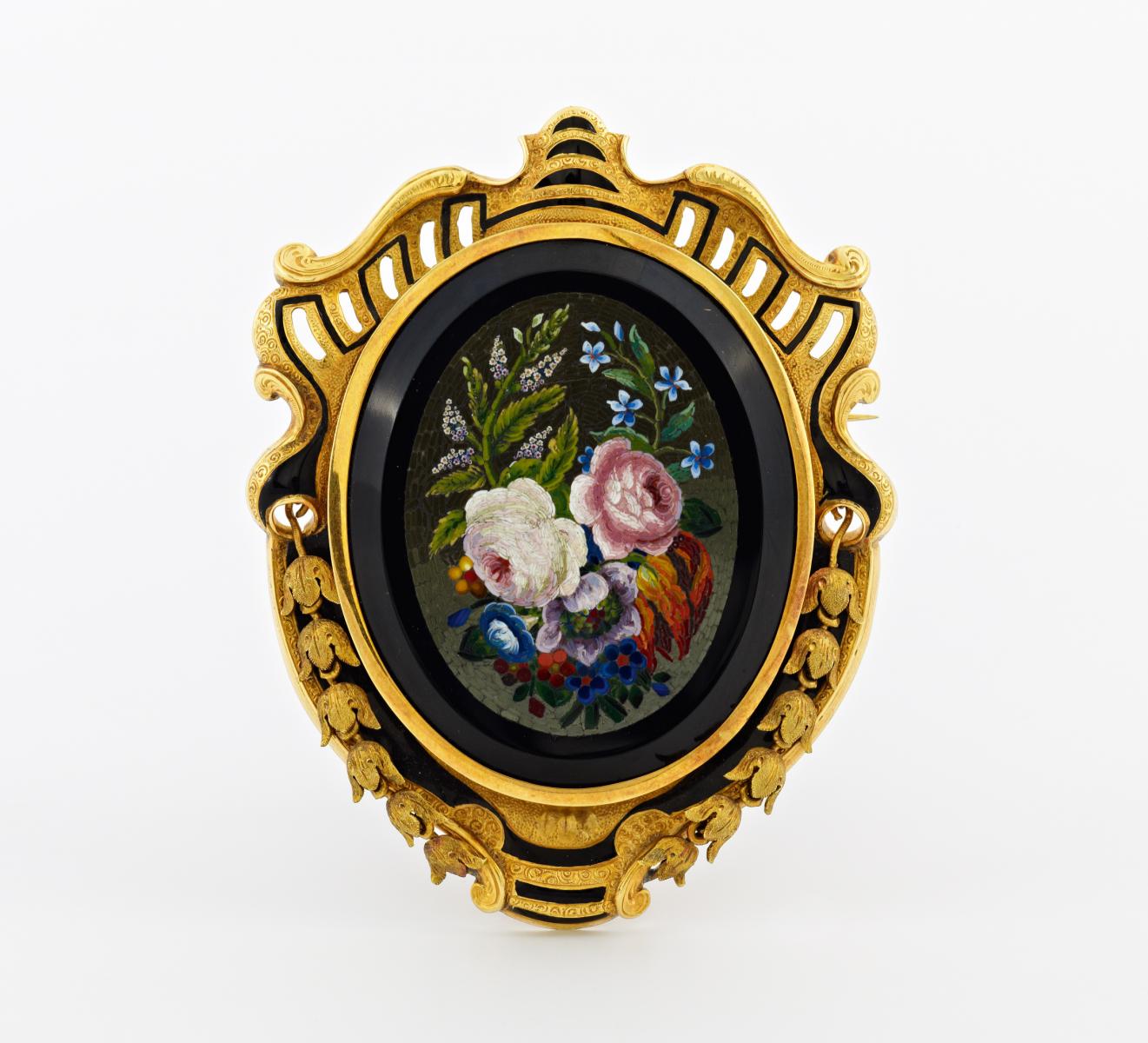 Brosche mit Pietra Dura Mosaik. 585/- GELBGOLD, SCHWARZES EMAIL.