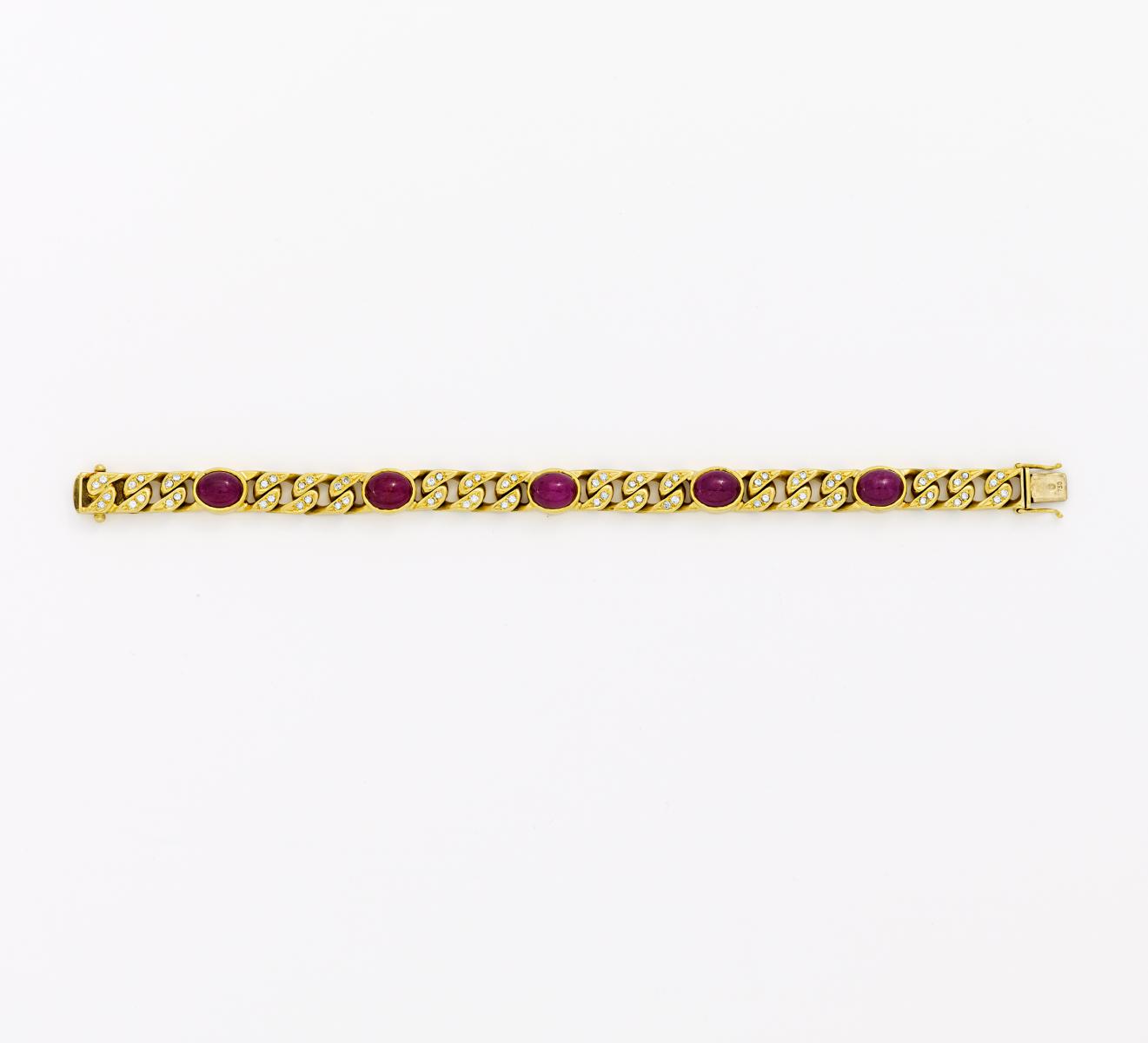 Massives Panzerarmband mit Rubin-Diamantbesatz. 750/- GELBGOLD.
