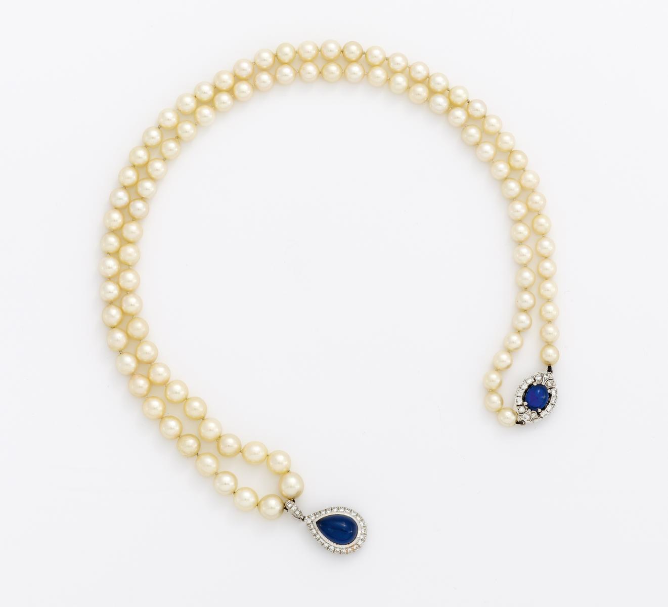 Süßwasser-Zuchtperlen Collier mit Sternsaphir-Diamant-Clip. 750/- WEIßGOLD.