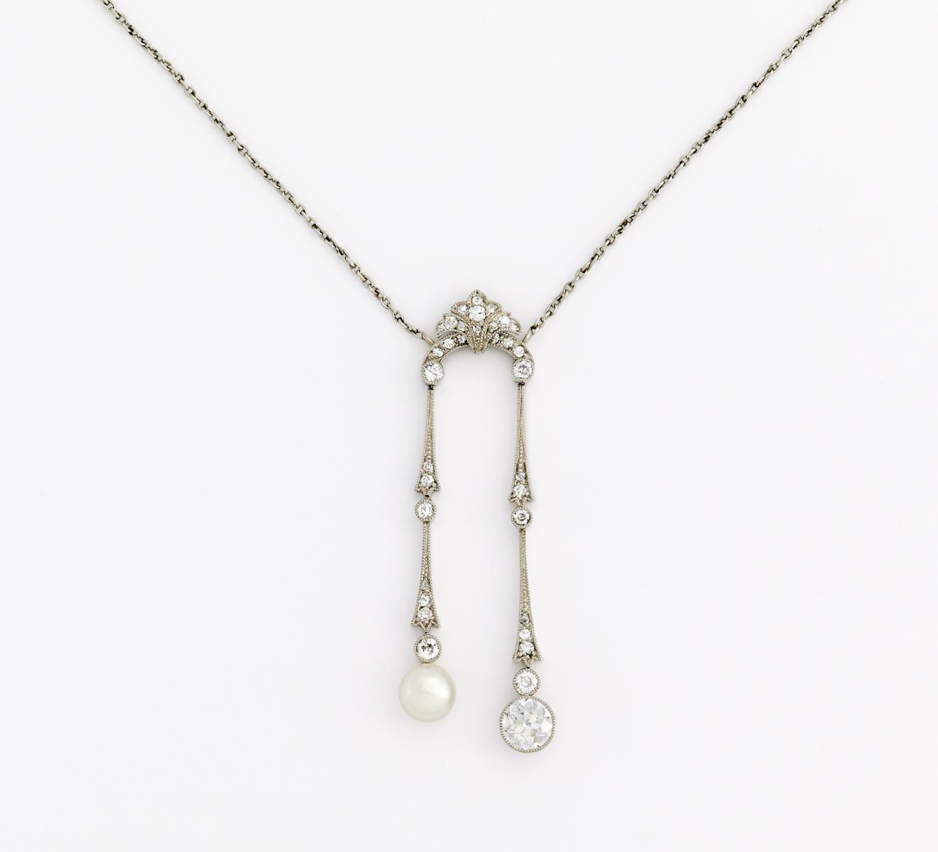Negligé-Collier mit Naturperl-Diamantbesatz. 585/- GELBGOLD MIT PLATINVERBÖDUNG.