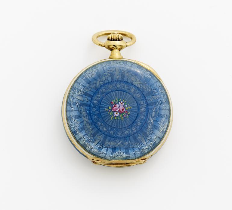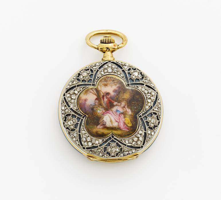 Schmucktaschenuhr mit Diamantbesatz. 585/- GELBGOLD, BLAUES EMAIL.