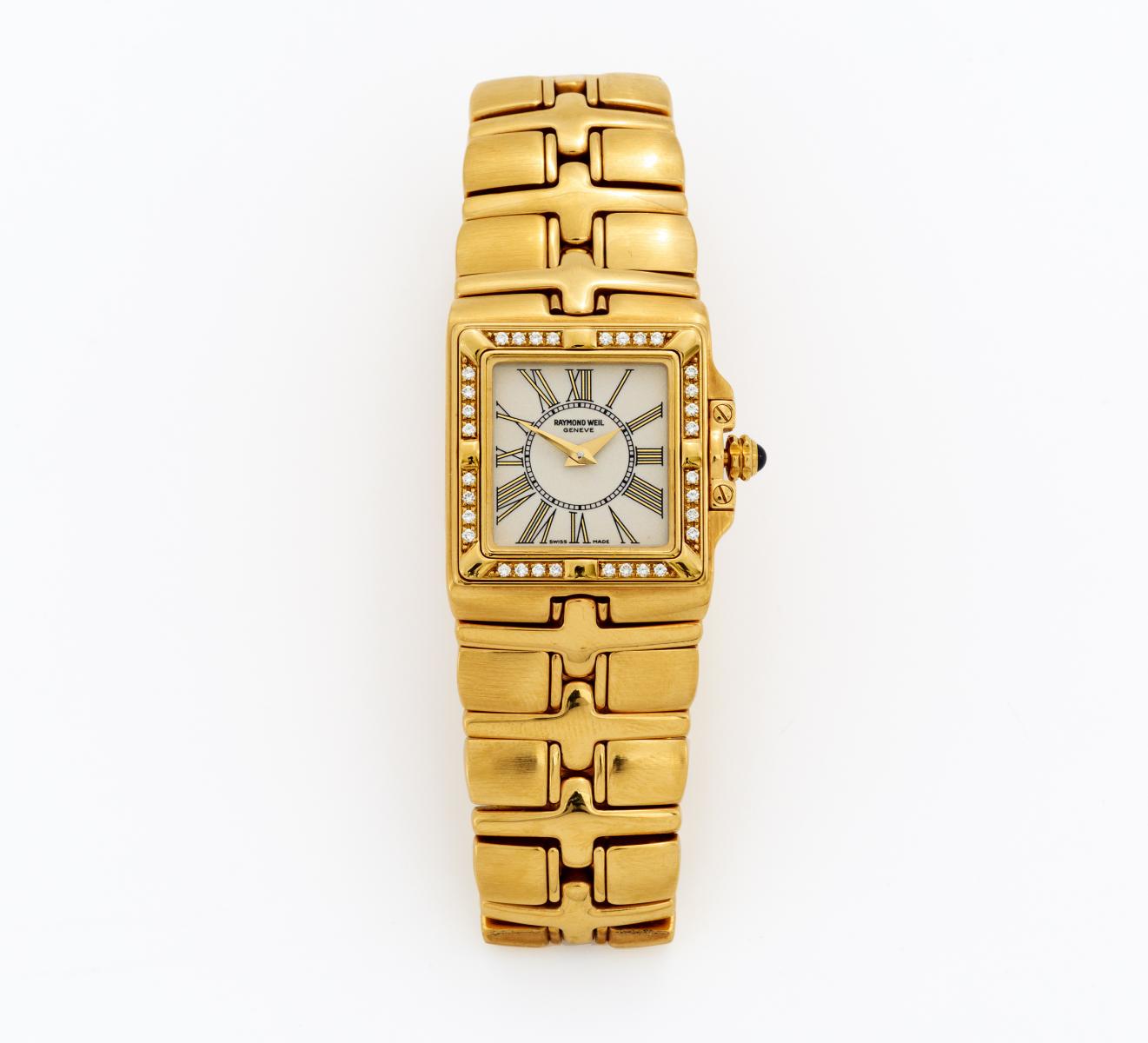 Raymond Weil. PARSIFAL. Damenarmbanduhr, 10.895. Gesamtgewicht: 750/- Gelbgold. Gehäuse-Nr.: L. 18,0cm, D. 21 x 21mm. Referenz-Nr.: 100,0g. Werk-Nr.: Schweiz.