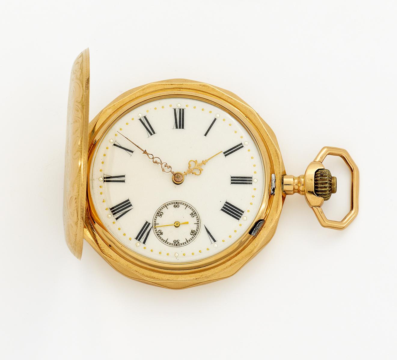 Unsignierte Savonette. Prunk-Savonette, 44749. Gesamtgewicht: 585/- Roségold. Gehäuse-Nr.: D. ca. 54mm. Referenz-Nr.: 107g. Werk-Nr.: Schweiz.