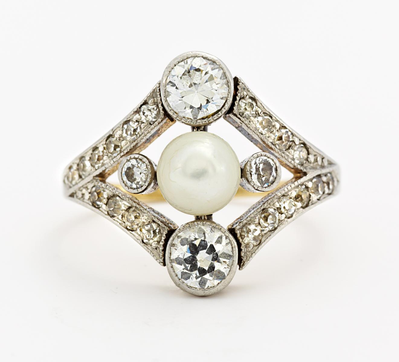 Art Deco. Ring mit Perl-Diamantbesatz. 750/- GELBGOLD MIT WEIßGOLDVERBÖDUNG.