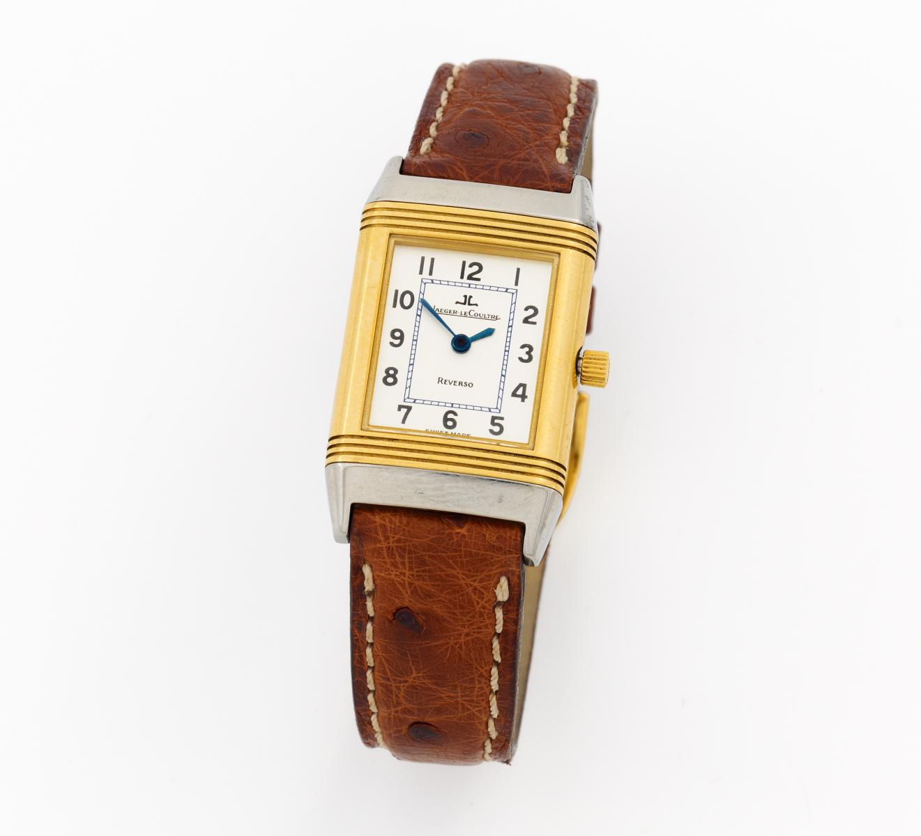 Jaeger LeCoultre. REVERSO CLASSIQUE. Damenarmbanduhr, 1740678. 260.5.08. Gesamtgewicht: Stahl/ Gelbgold. braunes Lederarmband, JLC-Dornschließe (vergoldet). Gehäuse-Nr.: D. ca. 32 x 19mm, L. ca. 20,5cm. Referenz-Nr.: 28,2g. Werk-Nr.: Schweiz.