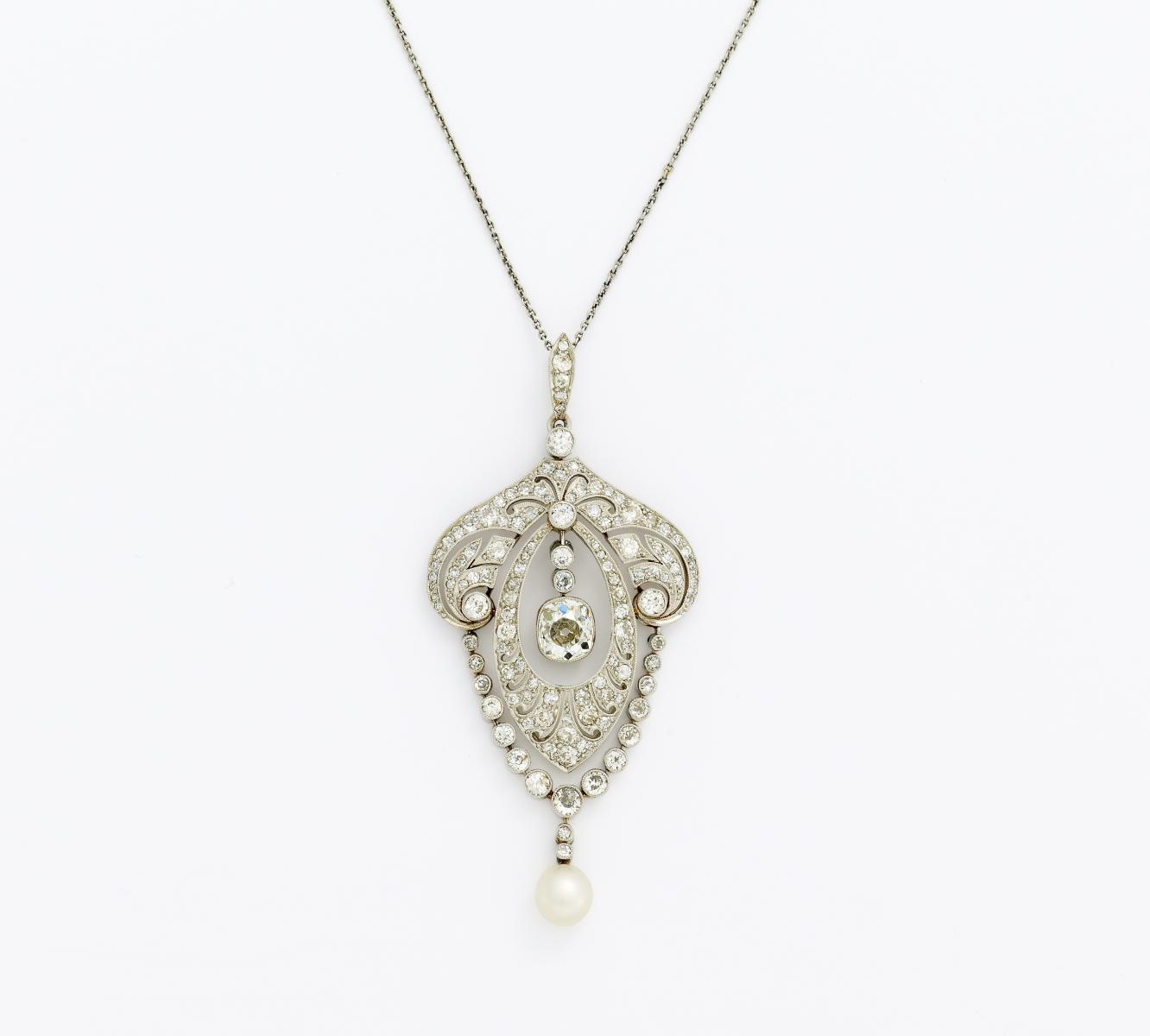 Anhängerkette mit Naturperl-Diamantbesatz. 585/- GELBGOLD MIT PLATINVERBÖDUNG.