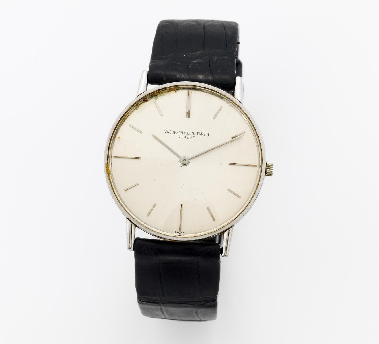 Vacheron & Constantin. Damen-/Herrenarmbanduhr, Gesamtgewicht: 750/- Weißgold. Lederarmband schwarz, Dornschließe (750/- Weißgold). Gehäuse-Nr.: L. 22,0cm, D. 33,0mm. Referenz-Nr.: 32,2g. Werk-Nr.: Schweiz.