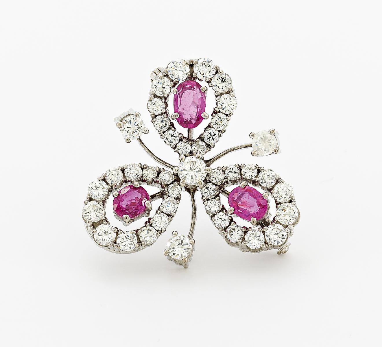 Historische Brosche mit Diamant-Rubinbesatz. 750/- WEIßGOLD.