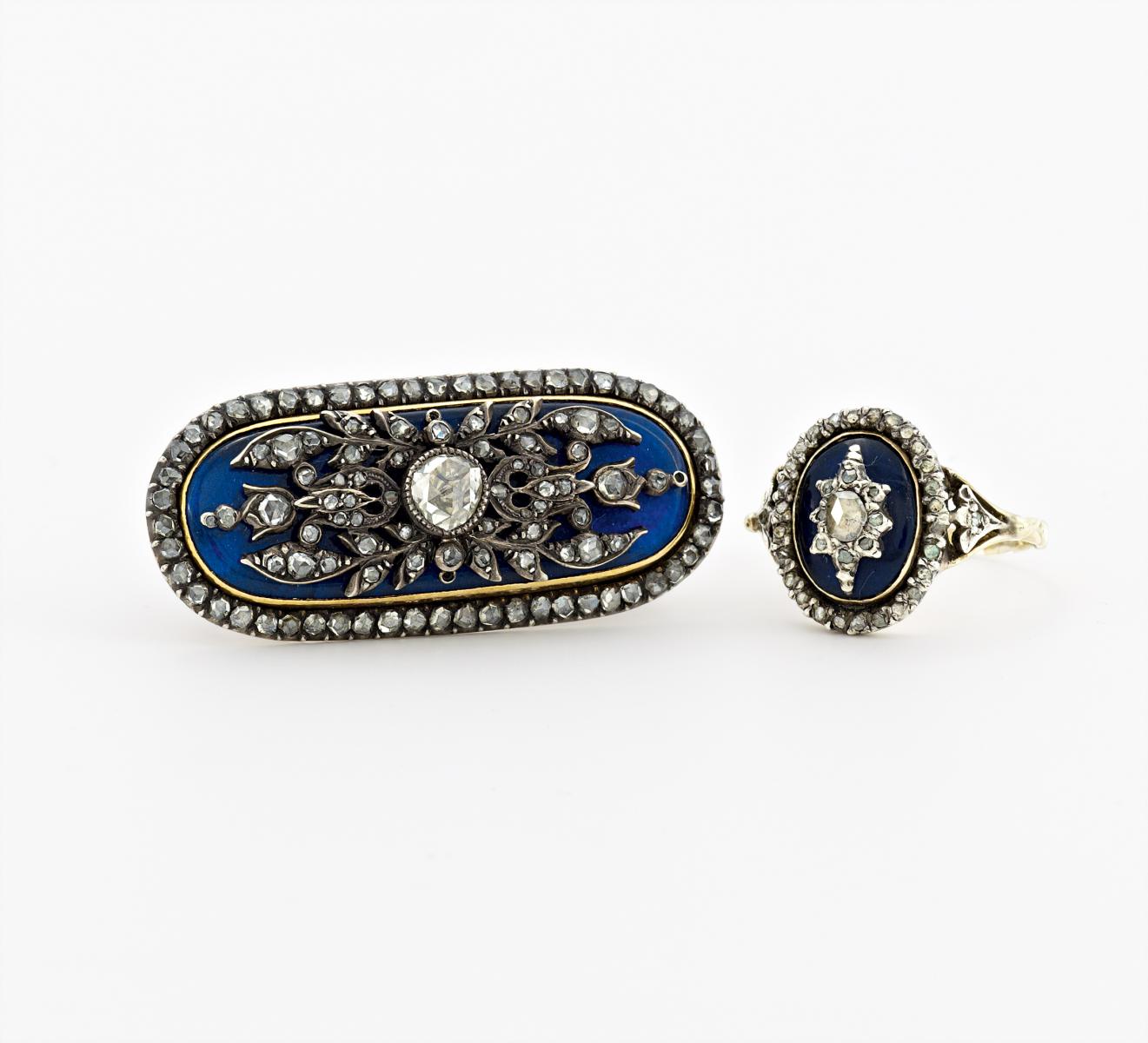 Set: Historische Brosche und Ring mit Diamantbesatz. BROSCHE: 585/- GELBGOLD MIT SILBERVERBÖDUNG, BLAUER EMAILLACK, RING: 583/- WEIßGOLD MIT GELBGOLDVERBÖDUNG.
