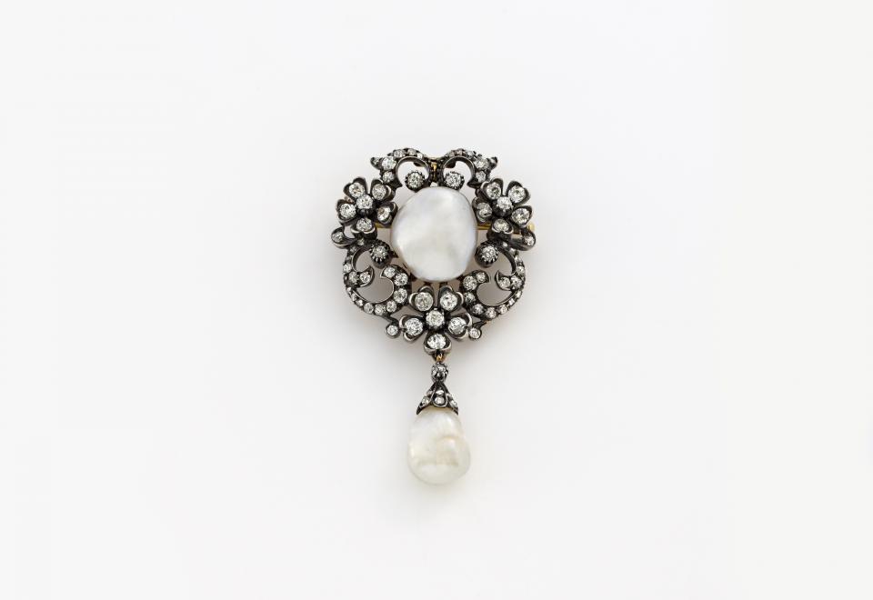 Historismus. Brosche mit Naturperl-Diamantbesatz. 585/- GELB-/ROSÉGOLD MIT SILBERVERBÖDUNG.