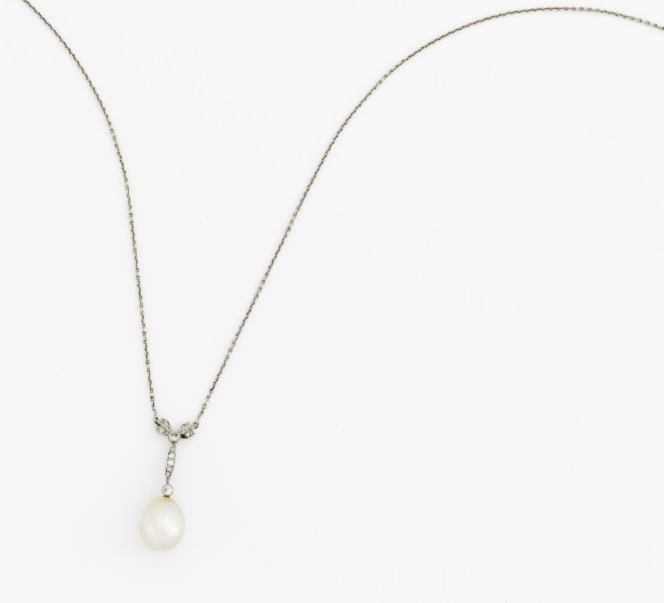 1 Naturperle als Tropfen, D. ca. 9,88-10,76 x 12,91mm, ca. 9,07ct, EU-RM: L. 44,0cm, Linienanhänger: L x B=3,0 x 10,7cm. Frankreich.