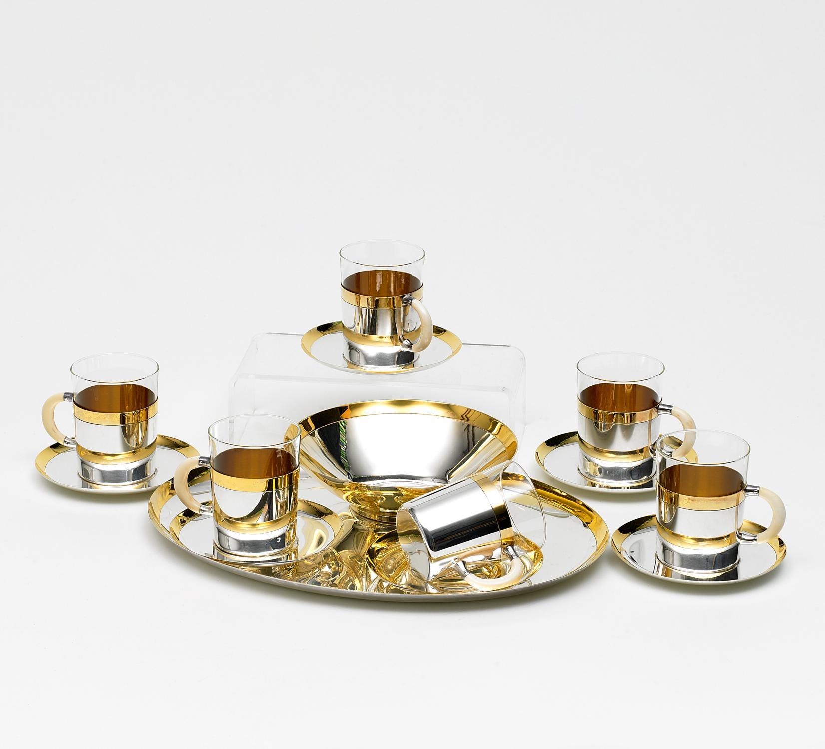 Silber, tlw. vergoldet, Glas, Bein. Insg. 14 Teile. Best. aus 6 Tassen mit UT, Tablett, Schale. Ca.2118g. Zustand A-B.