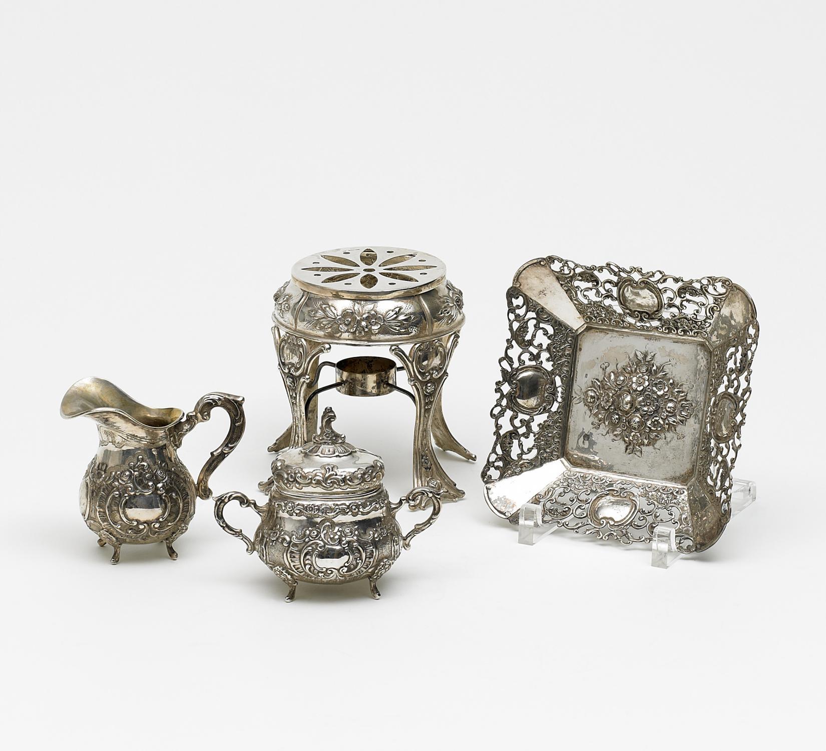 Milchgießer, Zuckerdose, Stövchen und Schale.