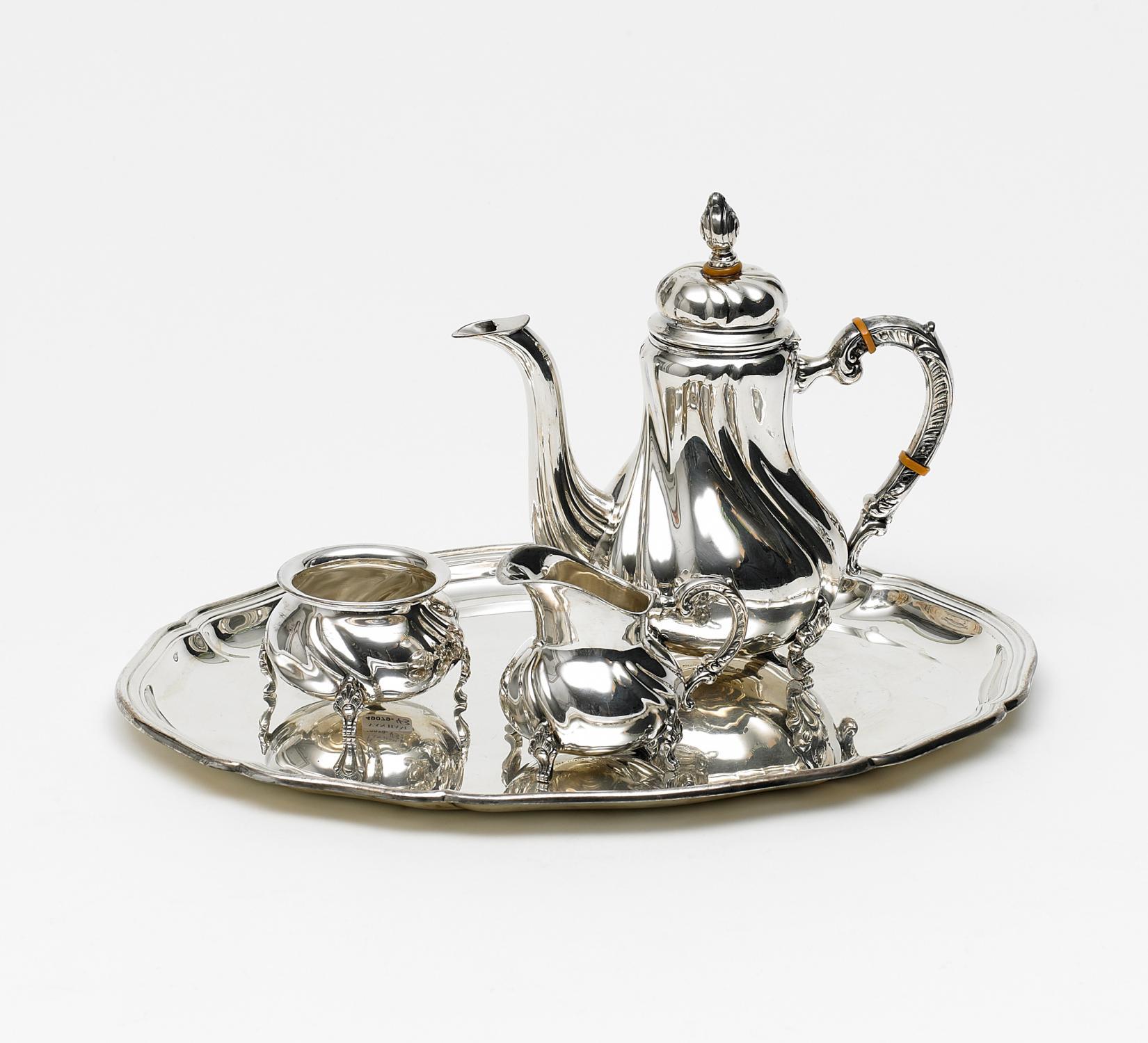 Silber. Mokkakanne, Zuckerschale, Sahnegießer. {Bei.:} Kl. Tablett. Silber. Ca. 667g. Zustand A/B.