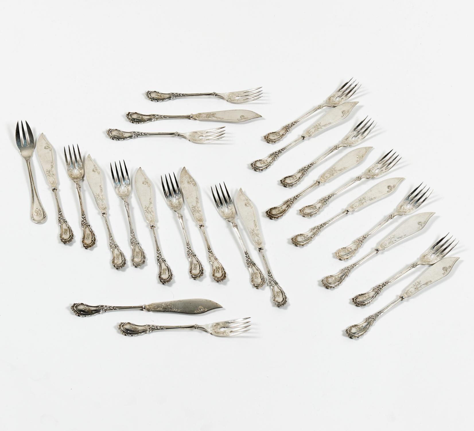 Silber. Je 12 Fischgabeln und -messer. {Beil.:}Gabel. Versilbert. Ca. 1165g. Zustand A/B.