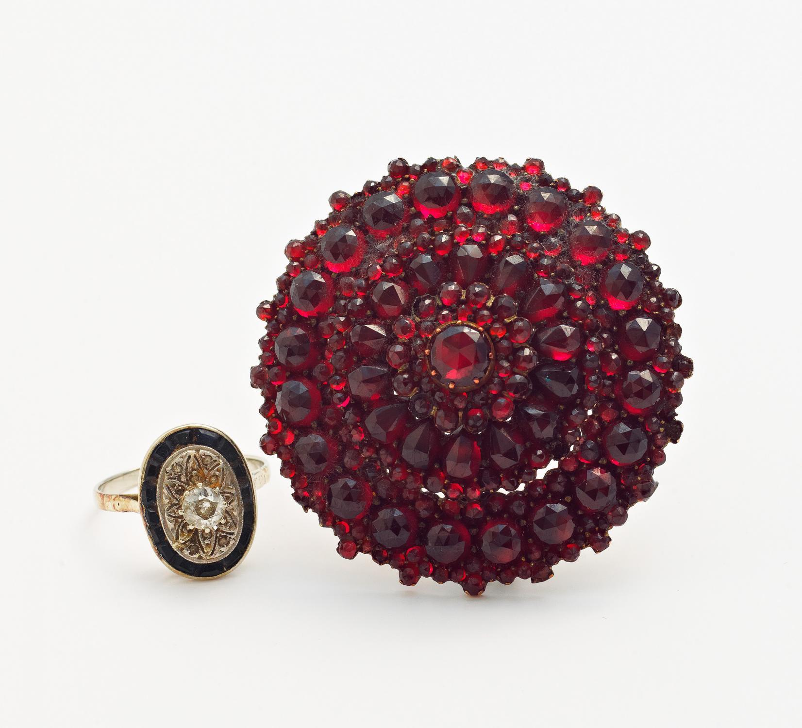 Ring: Silbern, Brosche: Messing. 1. 2,0g, 2. 12,1g. 16 winzige Saphir-Karrees, vielzählige böhmische Granate, 1 Altschliff-Diamant D. 4,2mm, 12 winzige Diamantrosen, EU-RM: 51. Ringtop: H x B=15 x 11mm, Brosche: D. 41mm.~