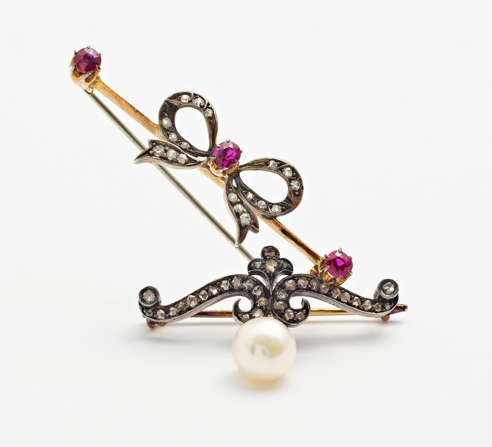 Rotgold, Silber. 11,2g. 3 oval facettierte, synthetische Rubine, 52 winzige Diamantrosen (teils foliert, eine fehlend), 1 barocke Süßwasser-Zuchtperle D. 9mm, weiß-rosé. L x B=3,8 x 2,8cm (inkl. Perle), 4,9 x 1,3cm.~ England, um 1880.