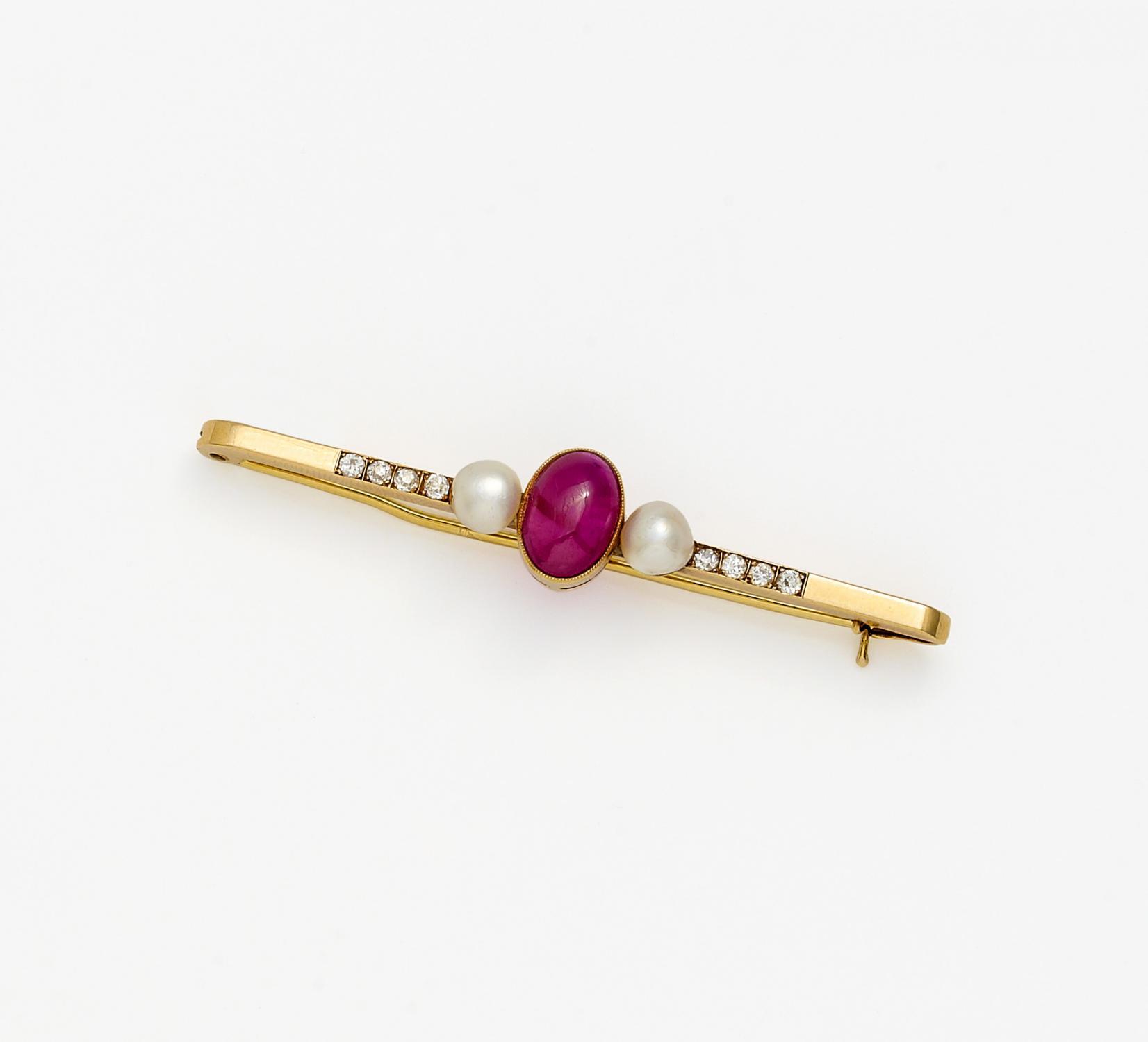 Gelbgold. 5,2g. 1 synthetischer Rubin-Cabochon, 8 winzige Diamantrosen, 2 vermutl. Naturperlen D.ca. 5,4mm. L. 5,5 x 0,2-1,0cm.~