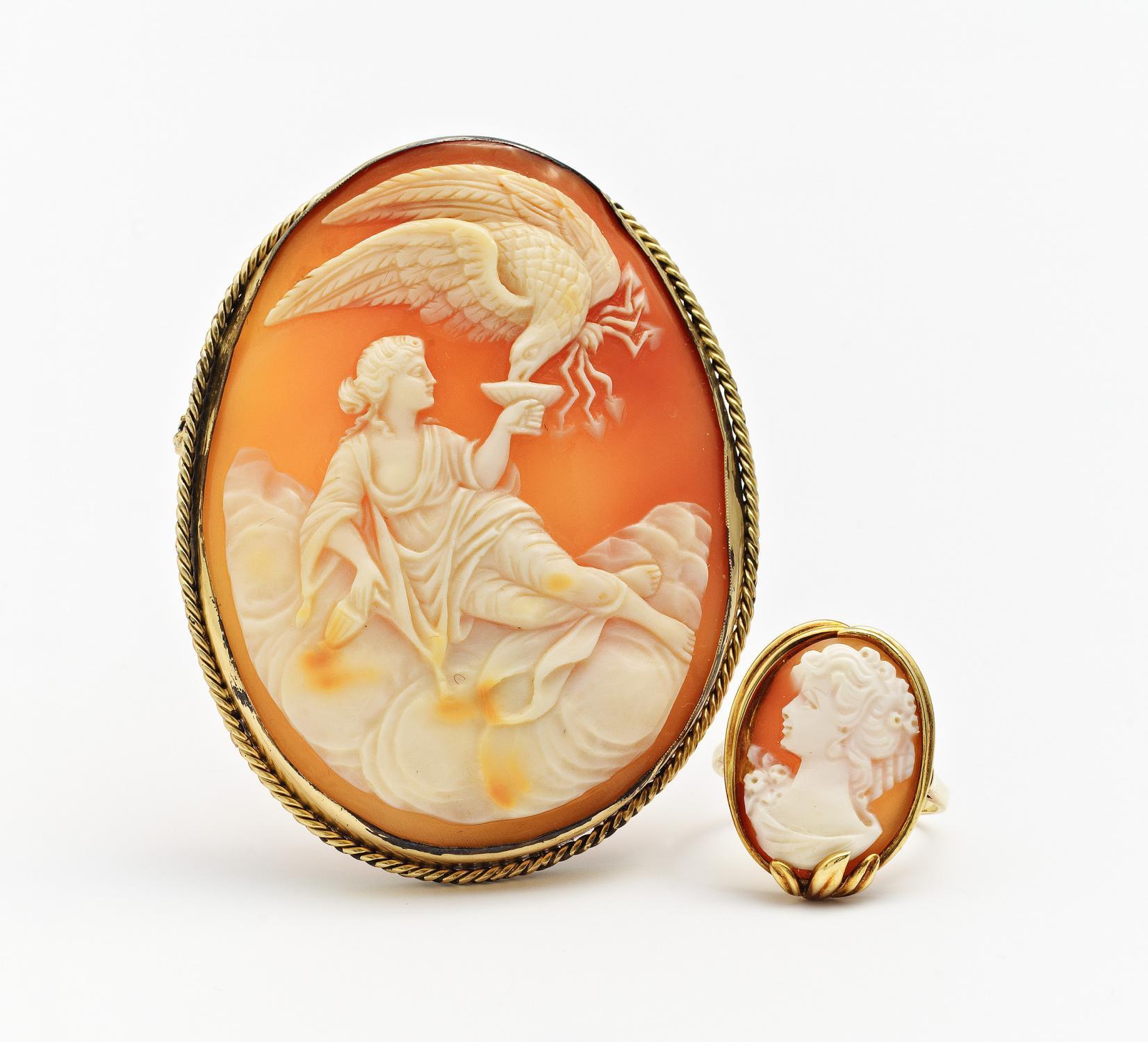 Ring: 585/- Gelbgold, gestempelt; Brosche: Goldfarben. 1.5,2g, 2.25,2g. 2 ovale Muschelschnitte (Meeresschnecke) D. 5,8 x 4,4cm, 2,0 x 1,4cm. EU-RM: 56. Brosche: H x B=6,2 x 4,8cm, Ringtop: 2,3 x 1,7cm.~ Anhängeröse an Brosche abgebrochen. Brosche: Mitteleuropa, um 1860; Ring: Deutschland, um