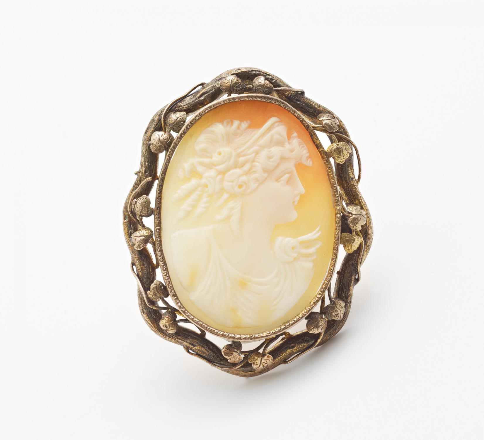 Goldfarben, Anhängeröse Gelbgold. 18,2g. 1 ovaler Muschelschnitt (Meeresschnecke) 4,4 x 3,3cm. H x B=6,7 x 4,7cm (inkl. Öse).~ Mitteleuropa, um 1880.
