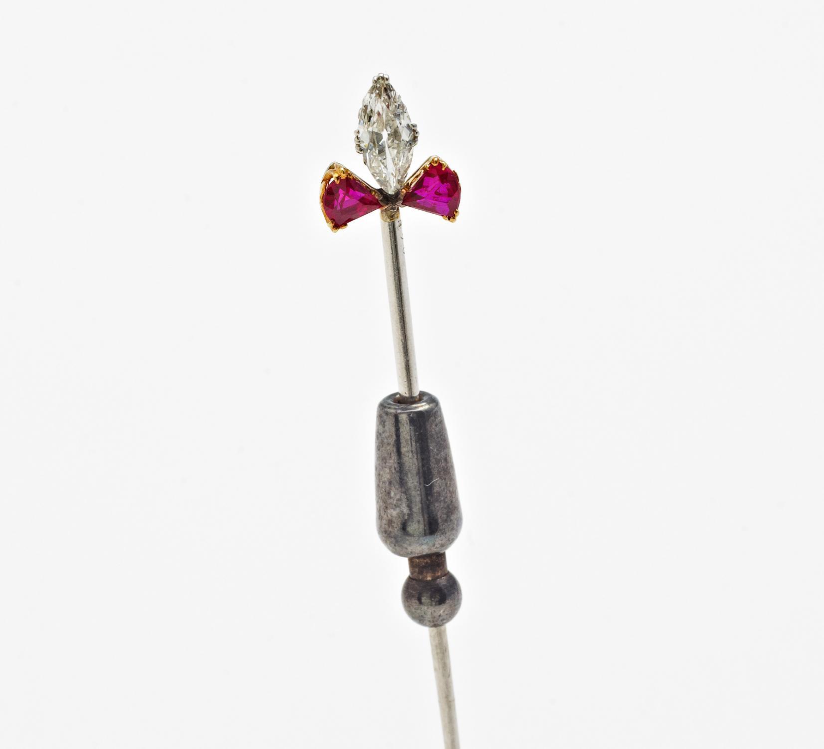 Weiß-/Rotgold. 2,1g. 2 fancy cut Rubine, 1 Diamant-Navette D. 7,6 x 3,3mm, L x B=ca. 6,7 x 0,8cm.~ England, um 1880.
