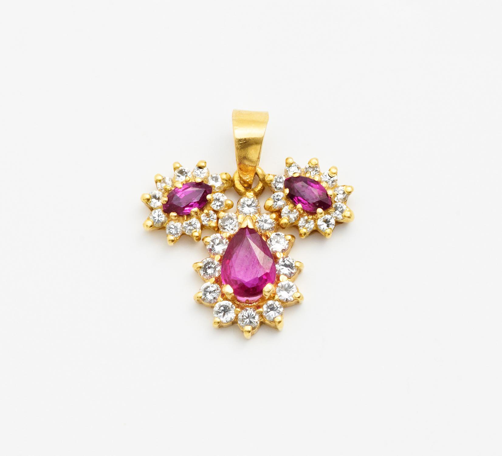 750/- Gelbgold, gestempelt. 3,0g. 1 tropfenförmiger Rubin, 2 Rubin-Navettes, 32 winzige Diamanten, H x B=1,9 x 1,8cm.~