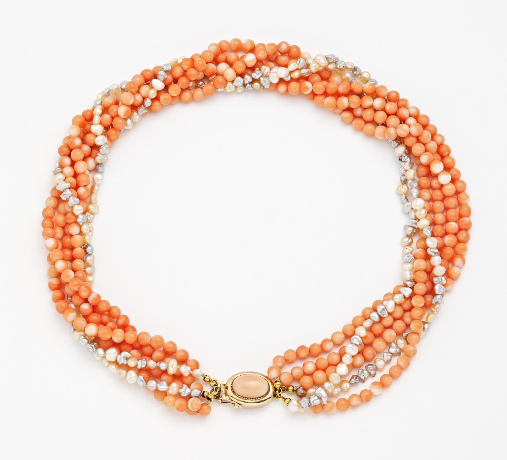 Verschluss: 585/- Gelbgold, gestempelt. 88,2g. 1 ovaler Korall-Cabochon 1,3 x 0,9cm, 4 Korallperl Stränge D. 5,1mm, 2 Blister-Zuchtperl Stränge, D. 3mm, grau-weiß. L. 47,0cm.~