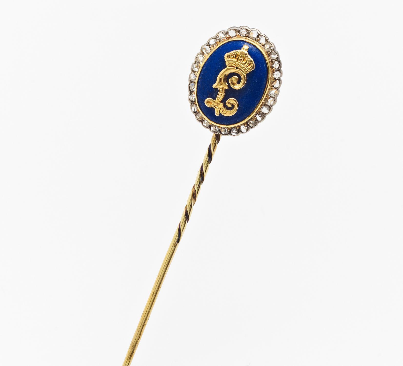 Gelbgold, Weißgoldverbödung. 2,2g. 1 ovaler Lapislazuli-Cabochon D.ca. 13 x 10mm, 29 winzige Diamantrosen, L. ca. 6,4cm.~ Auf dem Lapislazuli ein goldenes L mit Krone gestiftet. In Orig.-Etui.