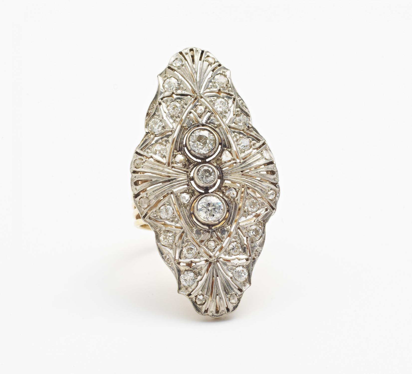Gelb-/Weißgold. 8,2g. Ca. 32 Diamanten im Rosen- und Altschliff, EU-RM: 54,5. Ringtop: H x B=4,0 x 2,2cm.~ Mitteleuropa, um 1960.