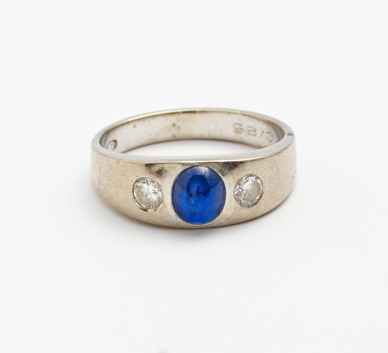 585/- Weißgold, gestempelt. 6,2g. 1 ovaler Saphir-Cabochon D.5 x 4mm, 2 winzige Brillanten, EU-RM: 54.